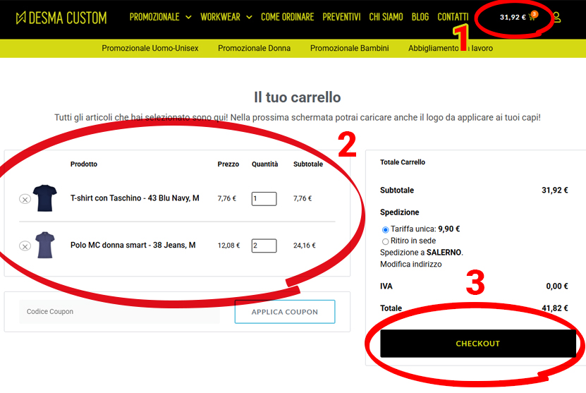 Quando hai selezionato tutto ciò che ti occorre, clicca sul tuo carrello (1), controlla che ci sia tutto (2) e procedi al checkout (3)