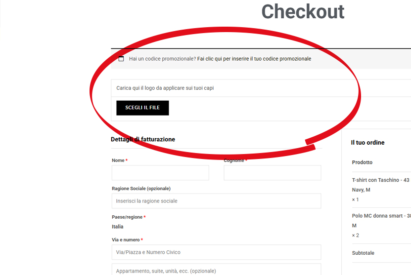 Al checkout troverai il campo per inviarci il tuo logo! Potrai anche dirci se vuoi che sia stampato (incluso nei prezzi che hai visto) oppure se lo preferisci ricamato (+1,oo € per ogni articolo selezionato)