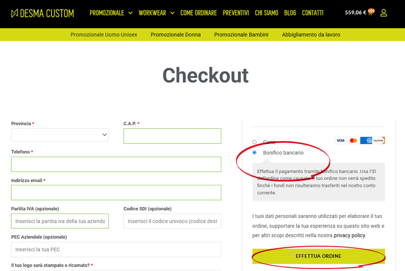 Inserisci i dati per fatturazione e spedizione. Scegli il tuo metodo di pagamento ma ATTENZIONE! Hai la possibilità di scegliere il metodo più comodo per te ma ti suggeriamo di utilizzare il bonifico in quanto il tuo ordine potrebbe avere diritto ad uno sconto ulteriore! Clicca su “EFFETTUA ORDINE” e attendi la conferma d’ordine in modo da poter conoscere l’importo esatto del tuo ordine!