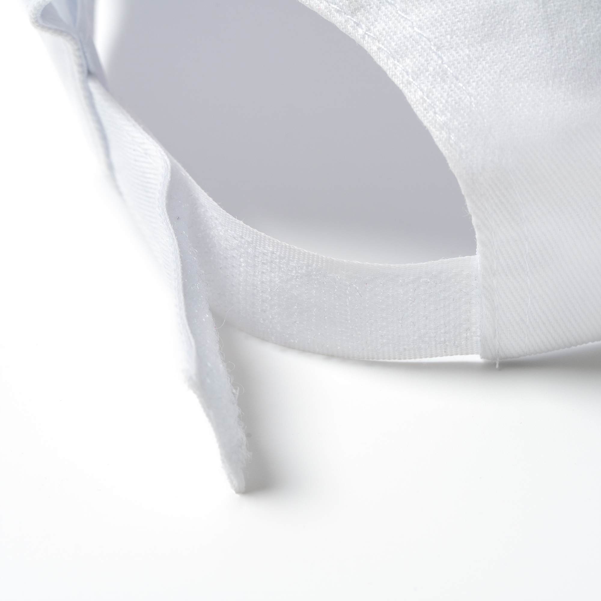 Berretto a 5 sezioni in 100% cotone. Chiusura regolabile in velcro e asole di ventilazione.