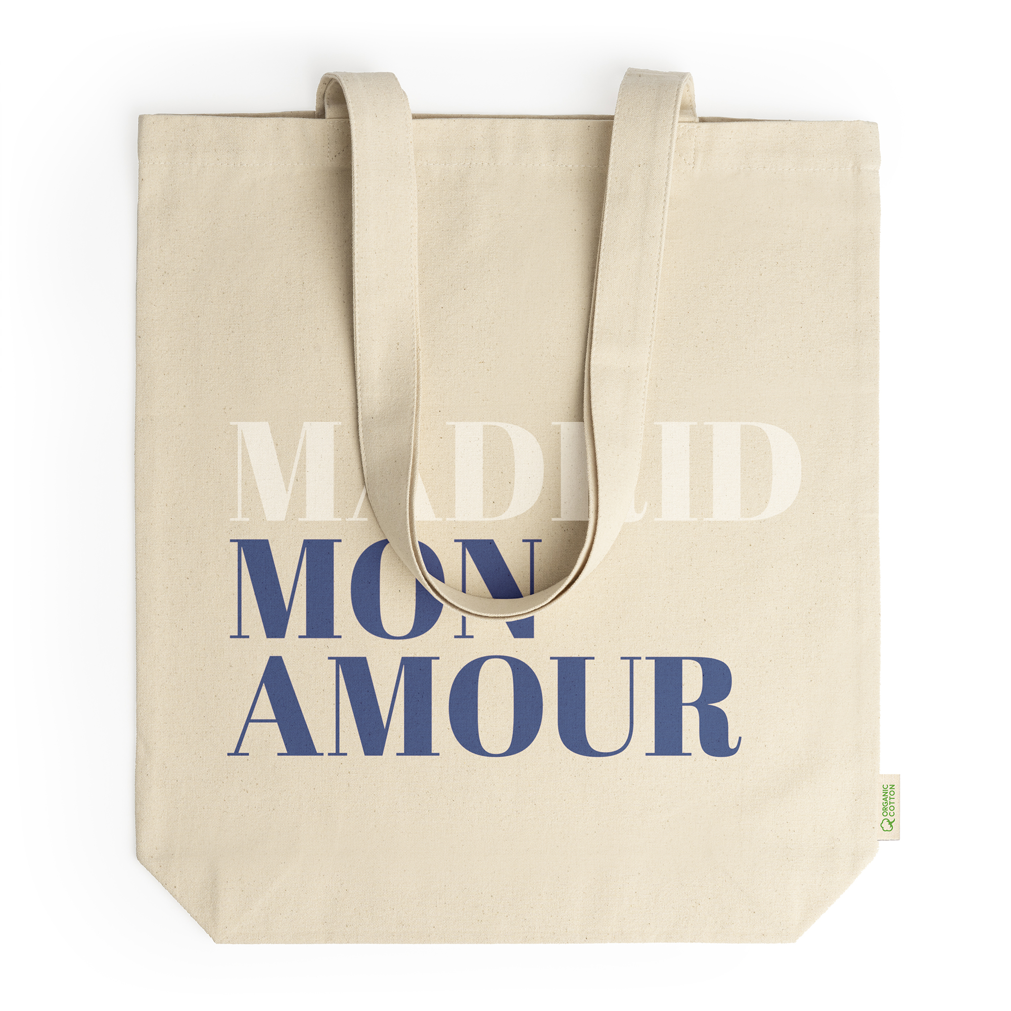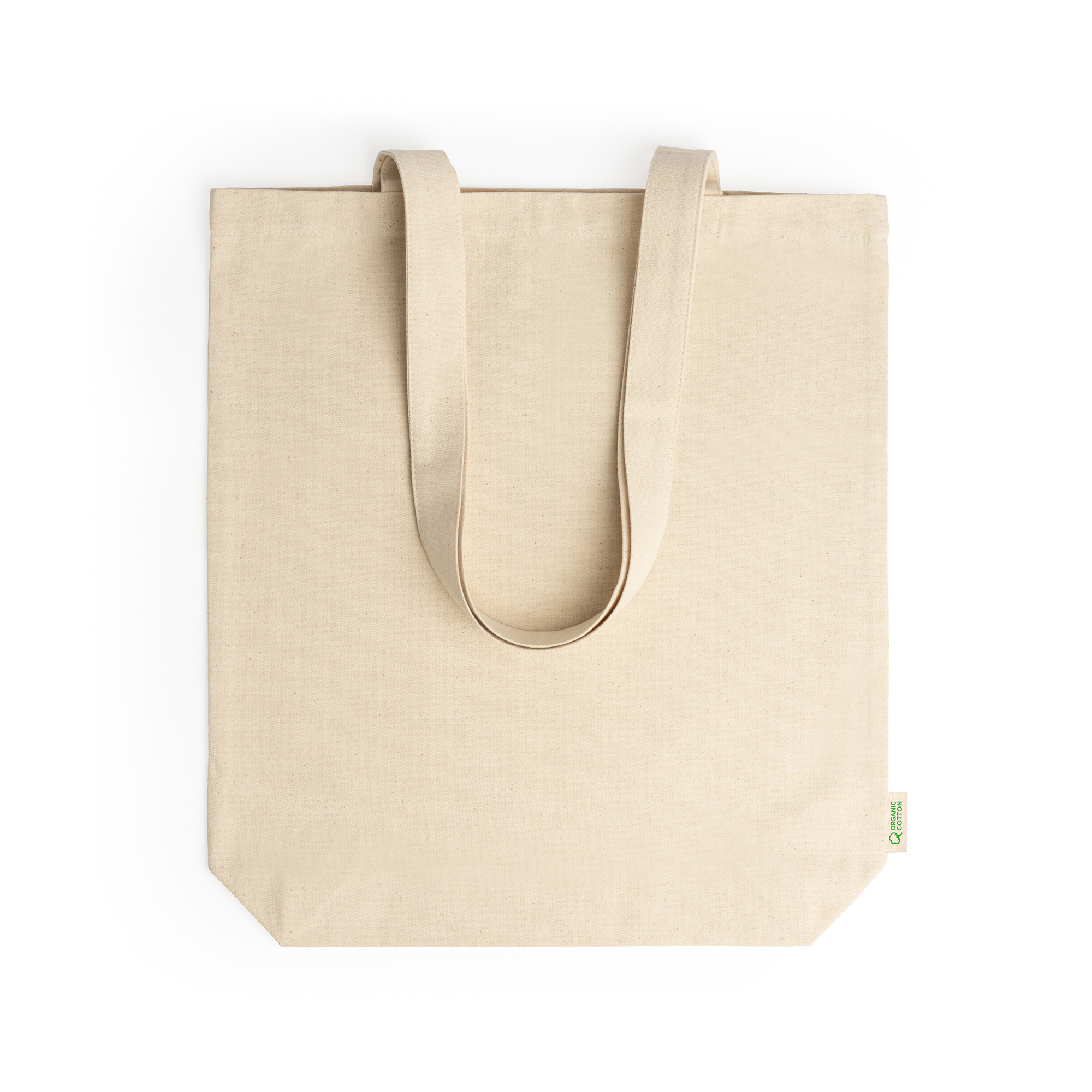 Borsa 100% cotone biologico 280 g/m² con soffietto e pratici manici lunghi 70 cm.