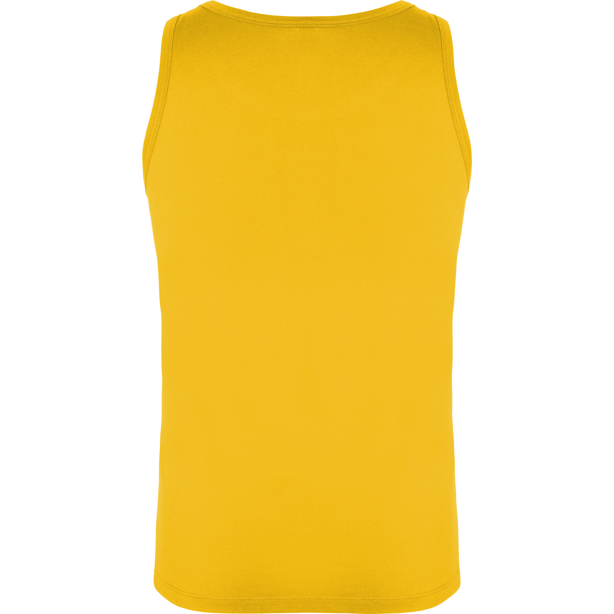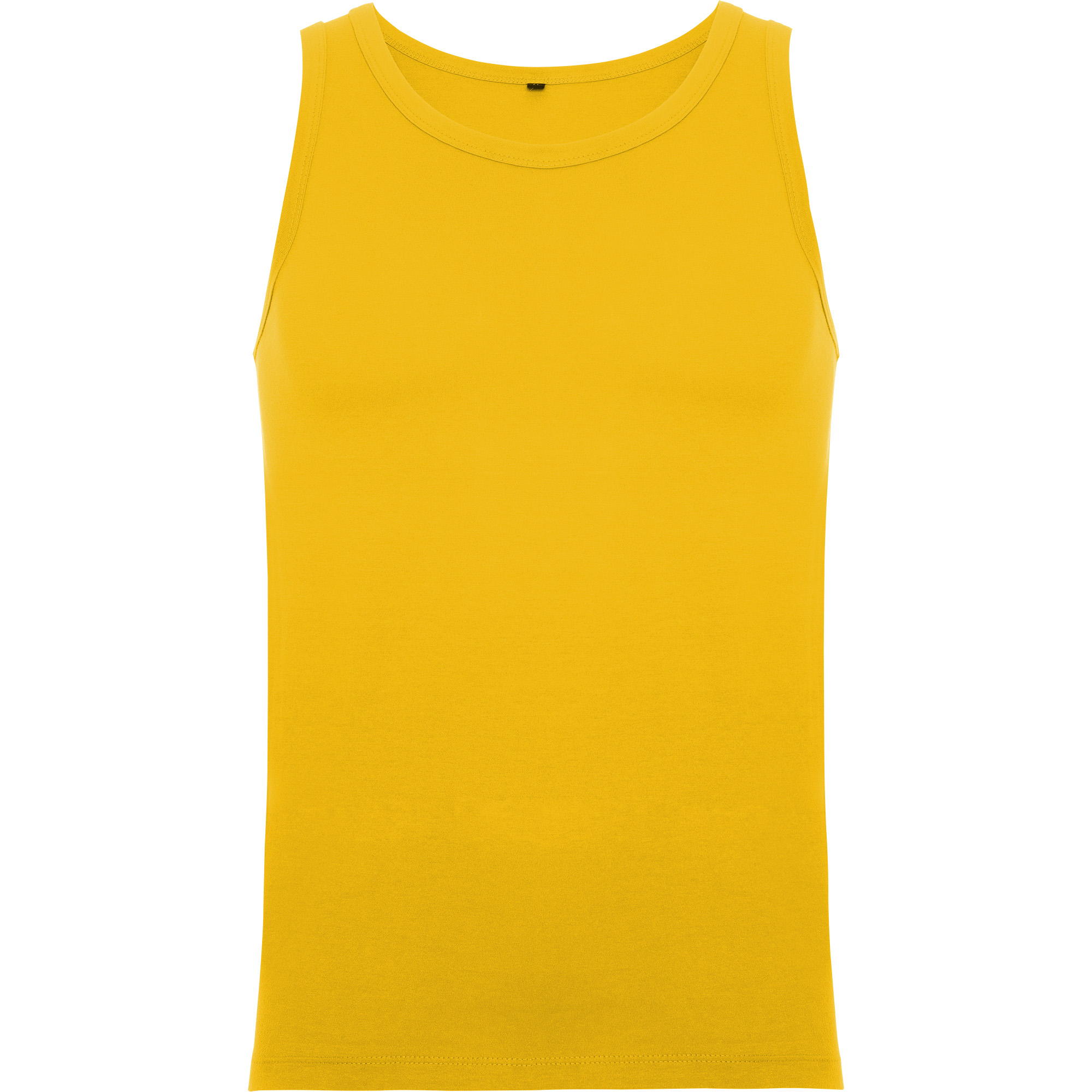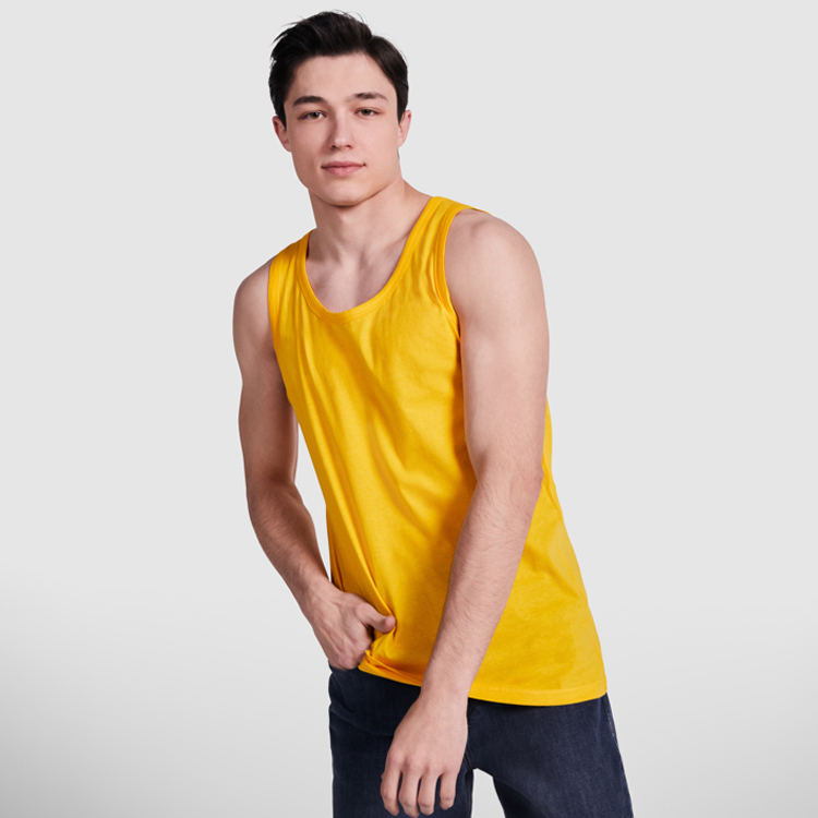 Canotta leggermente aderente. Girocollo e giromanica con bordo in tessuto coordinato.