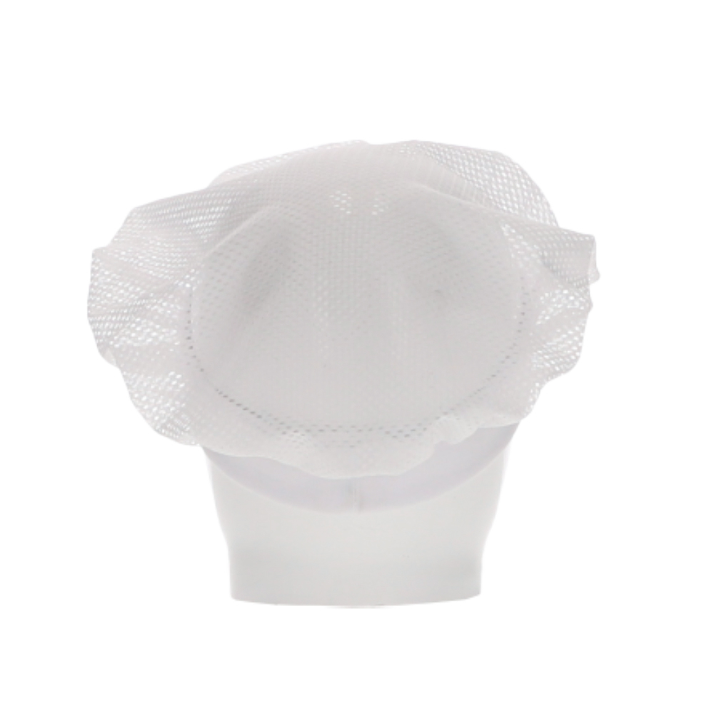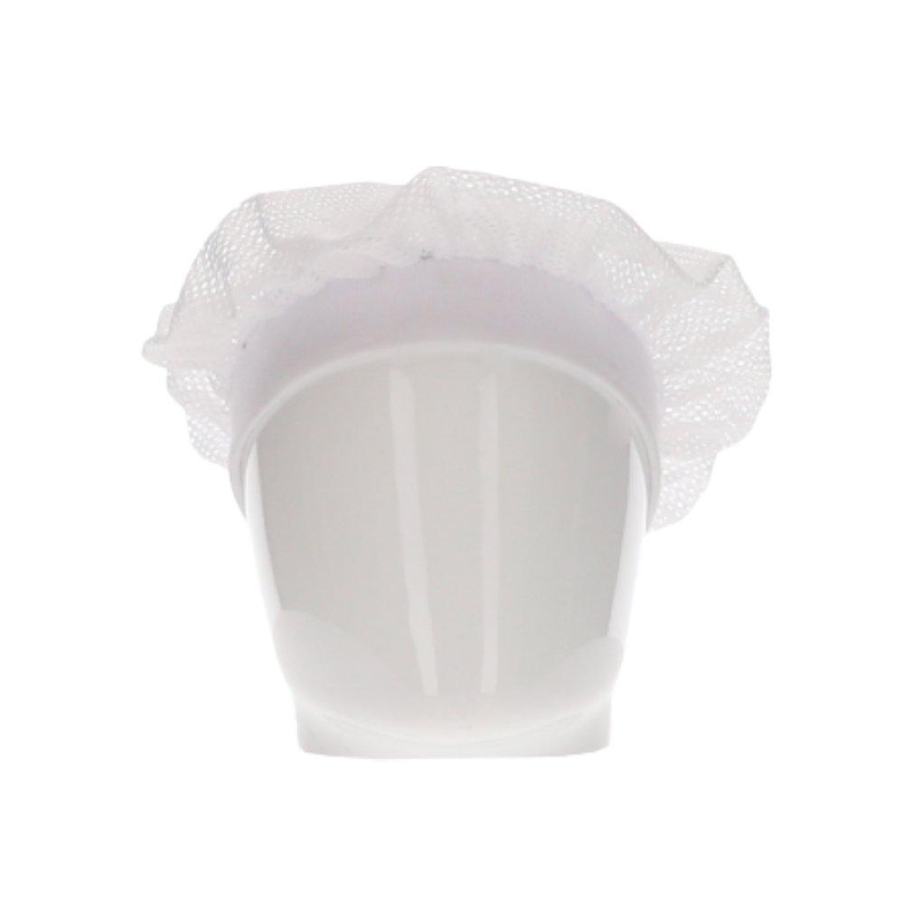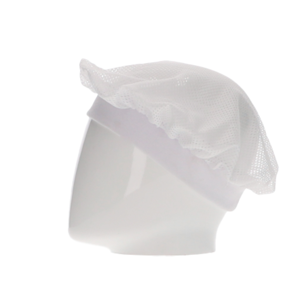Cappello con rete bianca per la manipolazione di alimenti. Realizzato con tessuto a rete 100% poliestere che garantisce resistenza ed elasticità, orlo elasticizzato a costine che si adatta comodamente, cuciture interne overlock per una maggiore resistenza.
