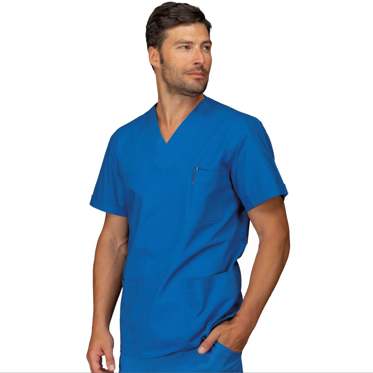 Casacca con collo a V unisex a mezza manica. Per settore medicale, estetico, sanitario e ospedaliero. Ideale come divisa da lavoro per medico ed infermiere uomo e donna. Con 2 tasche e taschino al petto.