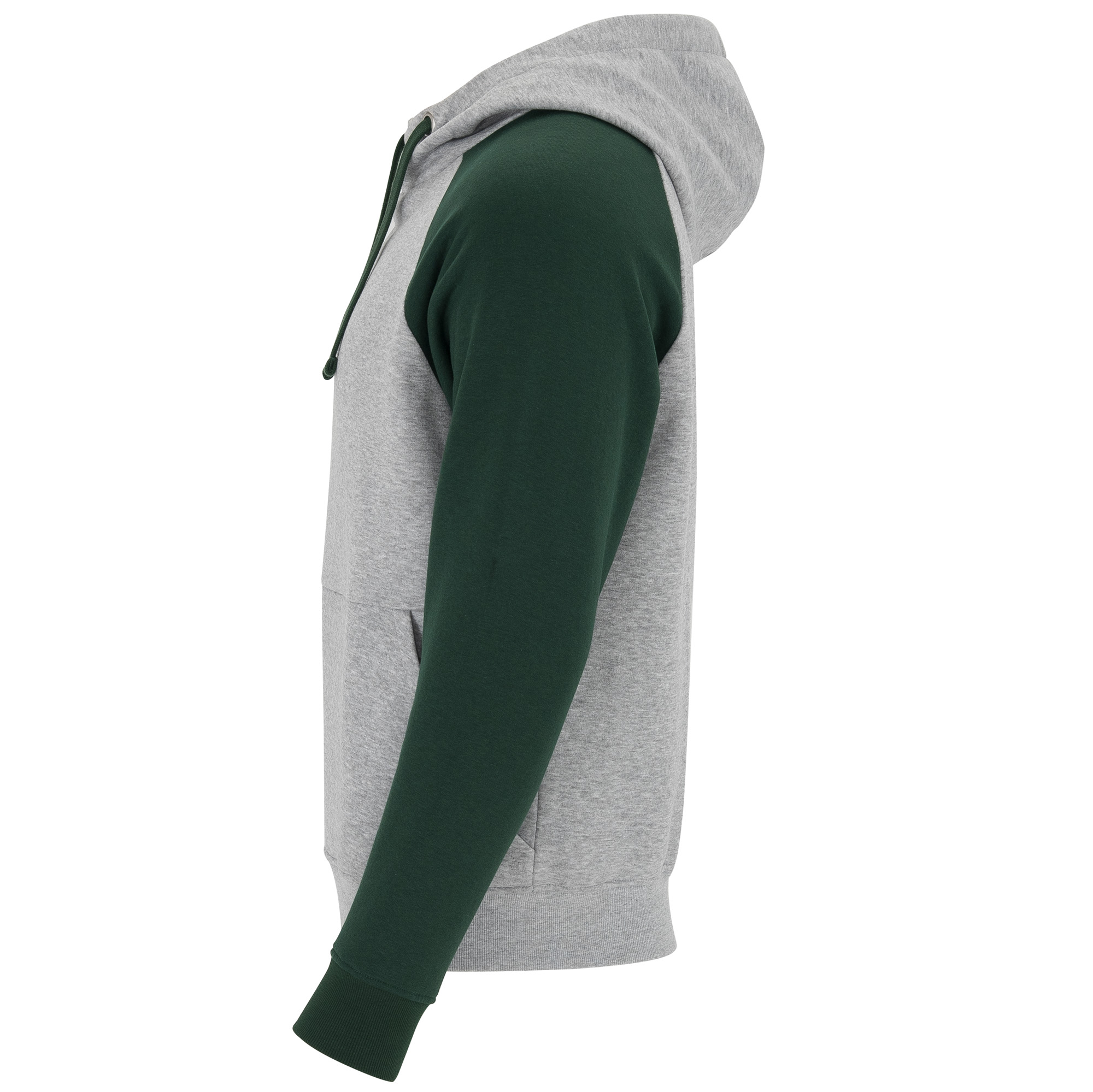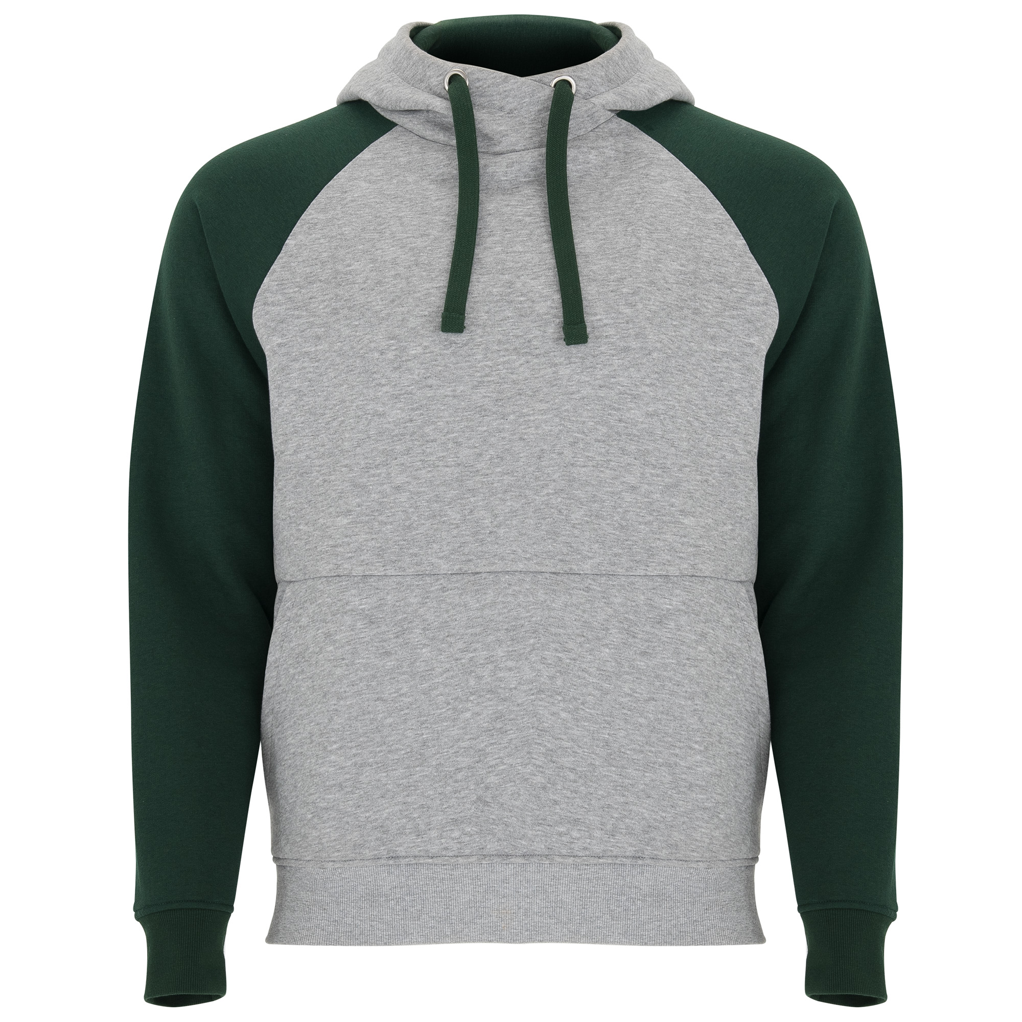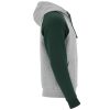 Felpa bicolore unisex. Cappuccio con coletto incrociato e occhielli metallici, interno e cordoncini a contrasto. Manica raglan a contrasto. Tasca a canguro. Polsini e girovita in costina 1×1 con elstan.