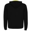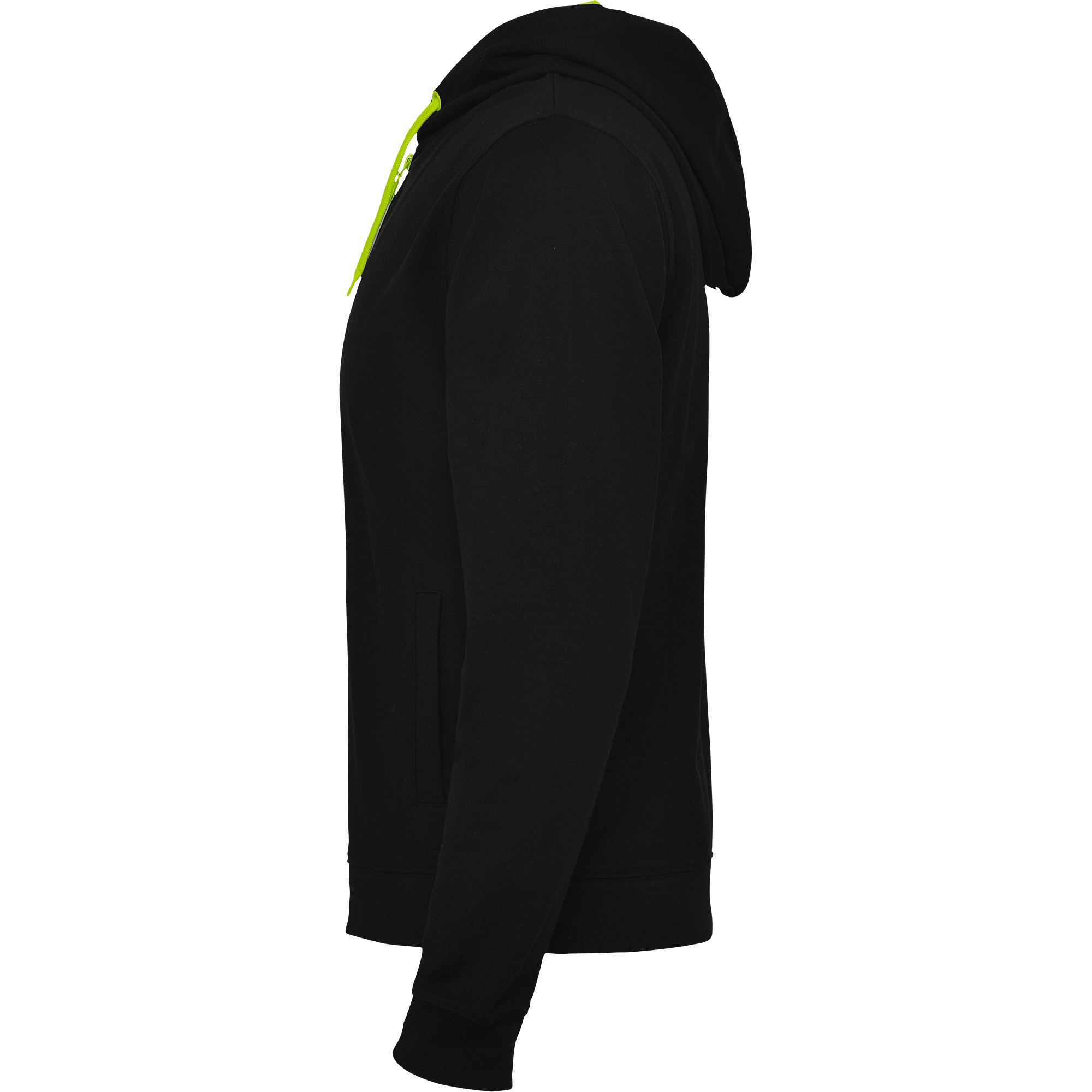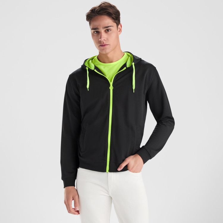 Felpa con cerniera frontale e cappuccio non garzato. Cappuccio foderato in rete di poliestere. Lacci piatti in poliestere. Polsini e cintura a coste 2×1 con elastan. Cuciture nastrate in tessuto coordinato. Opzioni di colore a tinta unita e a contrasto.
