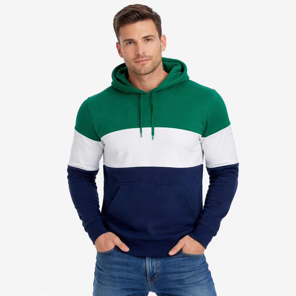 Felpa con cappuccio, tasca a canguro e disegno tricolore.