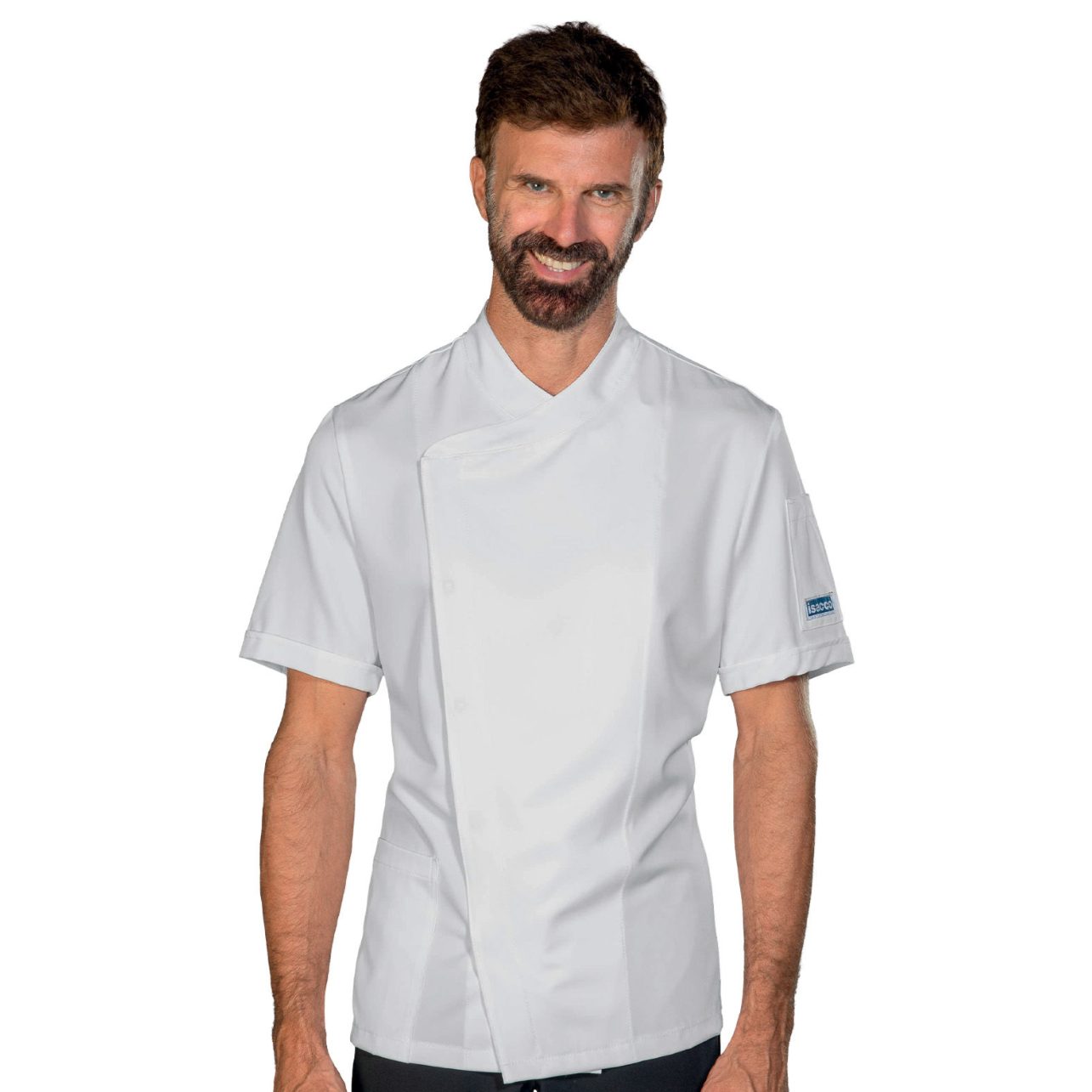 Giacca Bolton Tecnostretch bianca a mezza manica, un tessuto altamente tecnologico, fresco, leggero e resistente. Dotata di chiusura comodo laterale e ampia tasca, è perfetta per il settore sanitario, estetico e alberghiero. La combinazione tra stile e funzionalità lo rende essenziale per chi cerca un look professionale e confortevole