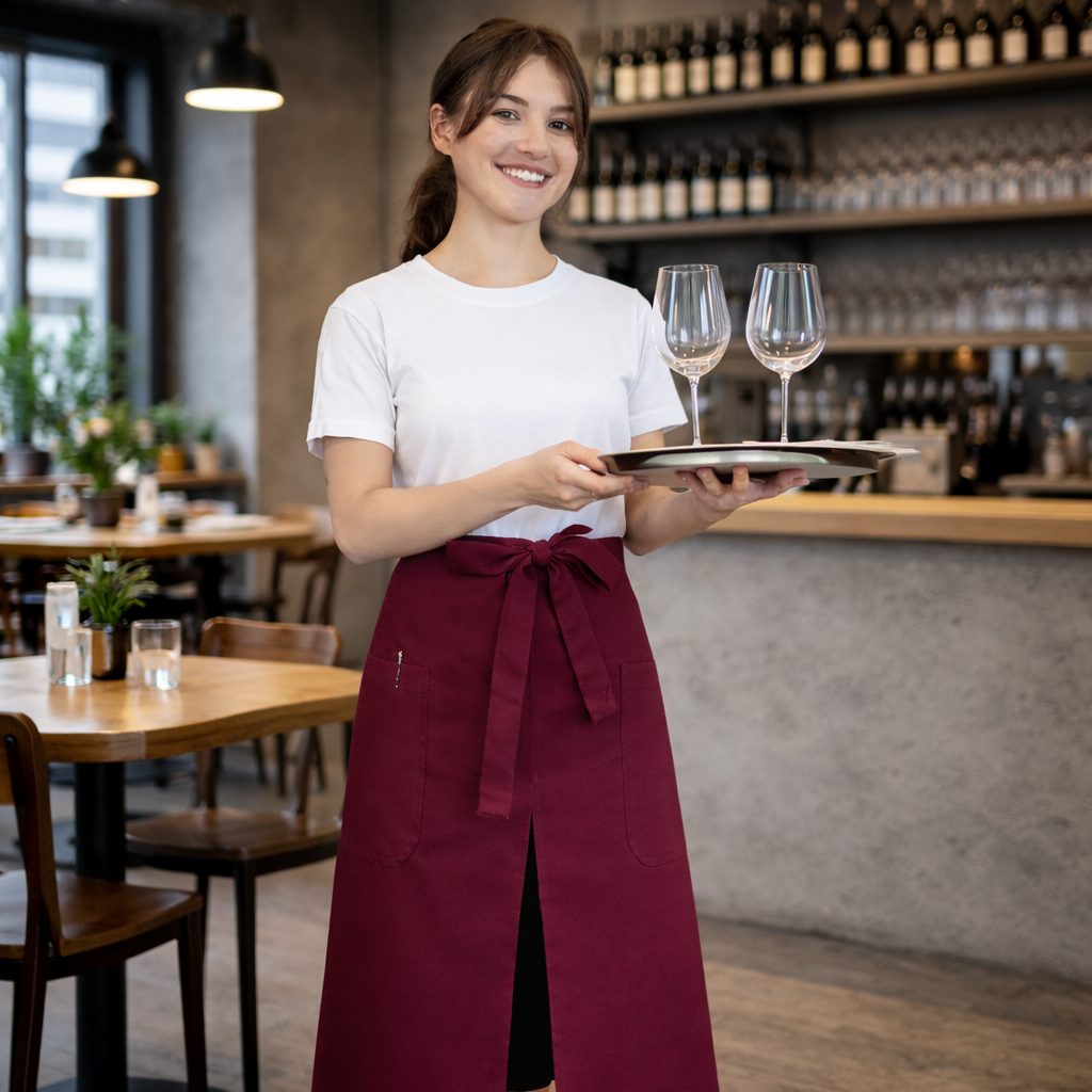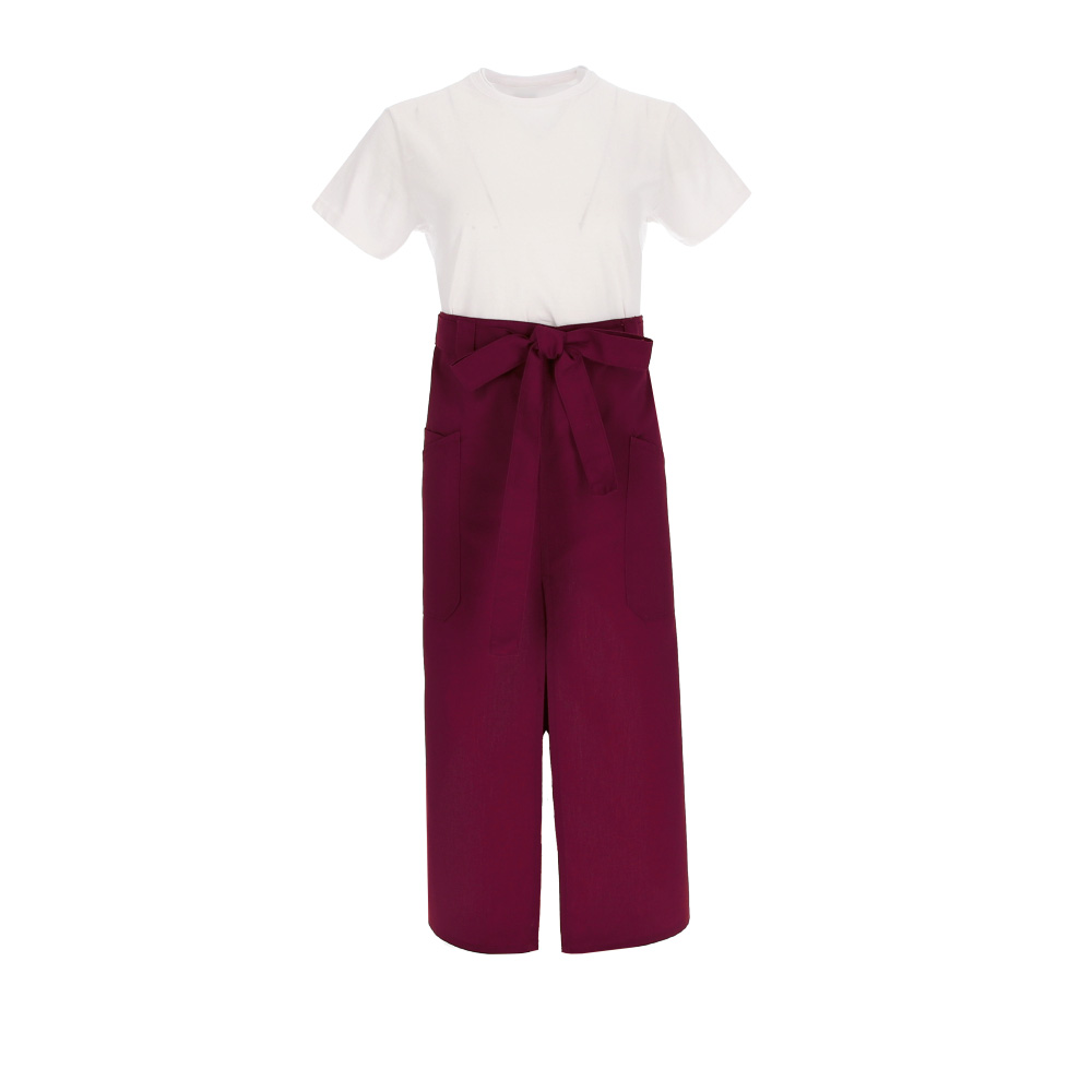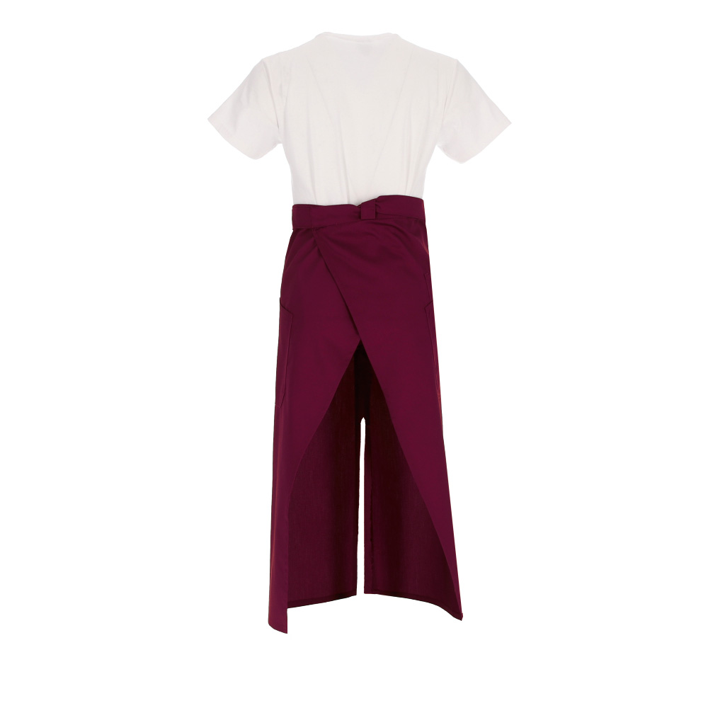 Grembiule lungo con apertura. Realizzato in twill misto cotone-poliestere resistente e duraturo, vita con cinturini laterali e passanti da regolare mediante nodo, apertura frontale per una maggiore mobilità e comodità, due tasche frontali, quella destra compartimentata, per avere tutto a portata di mano.