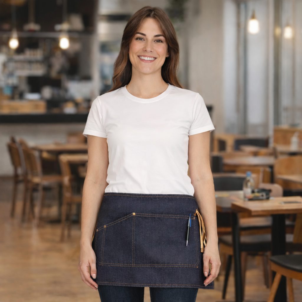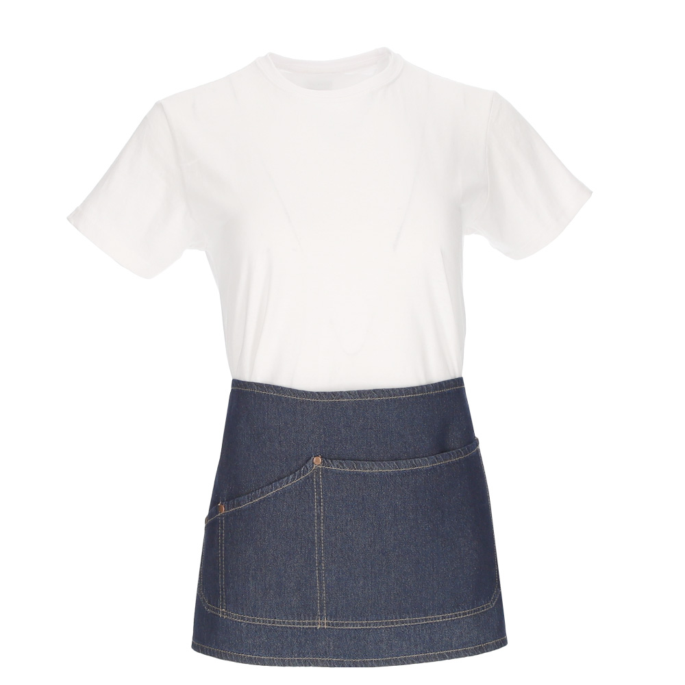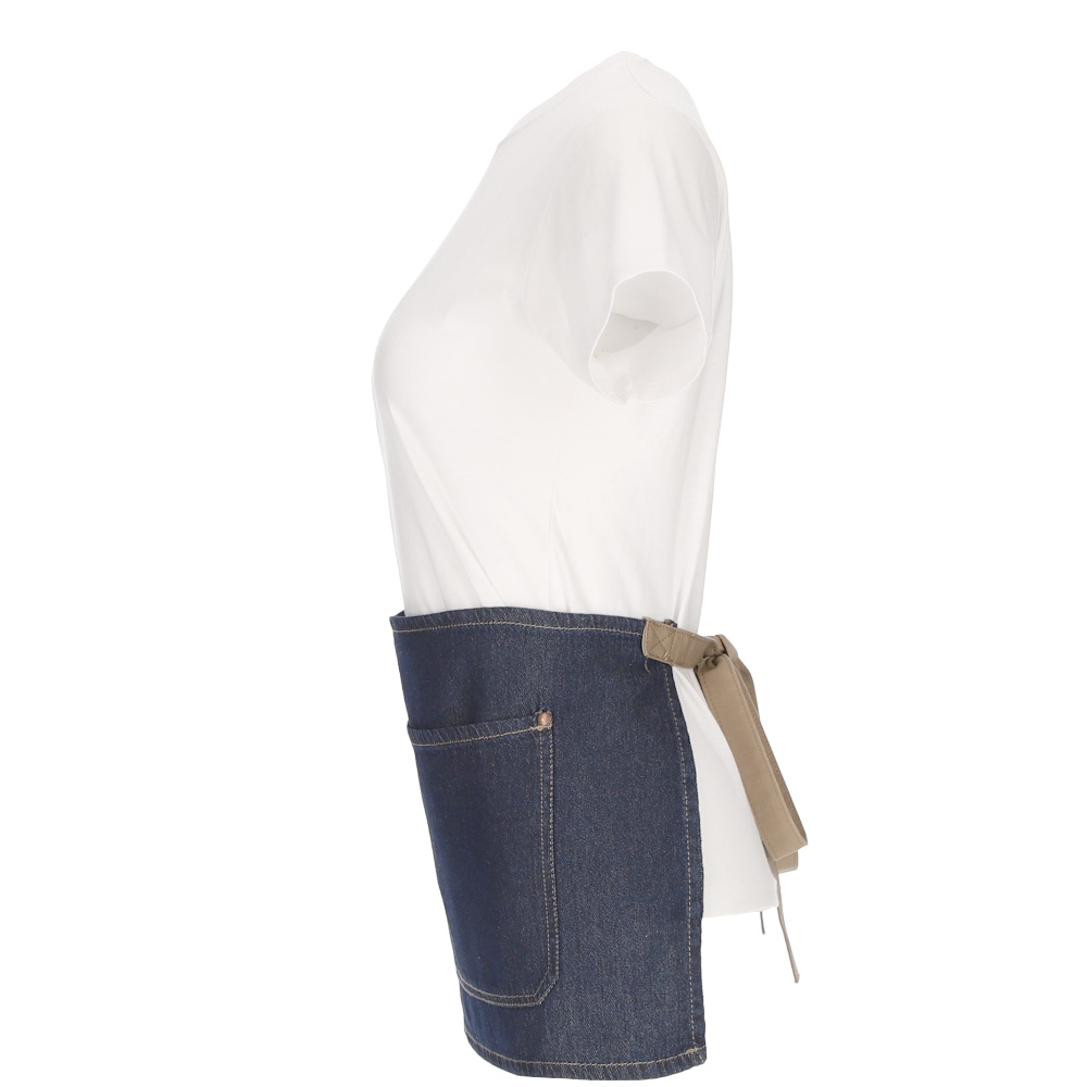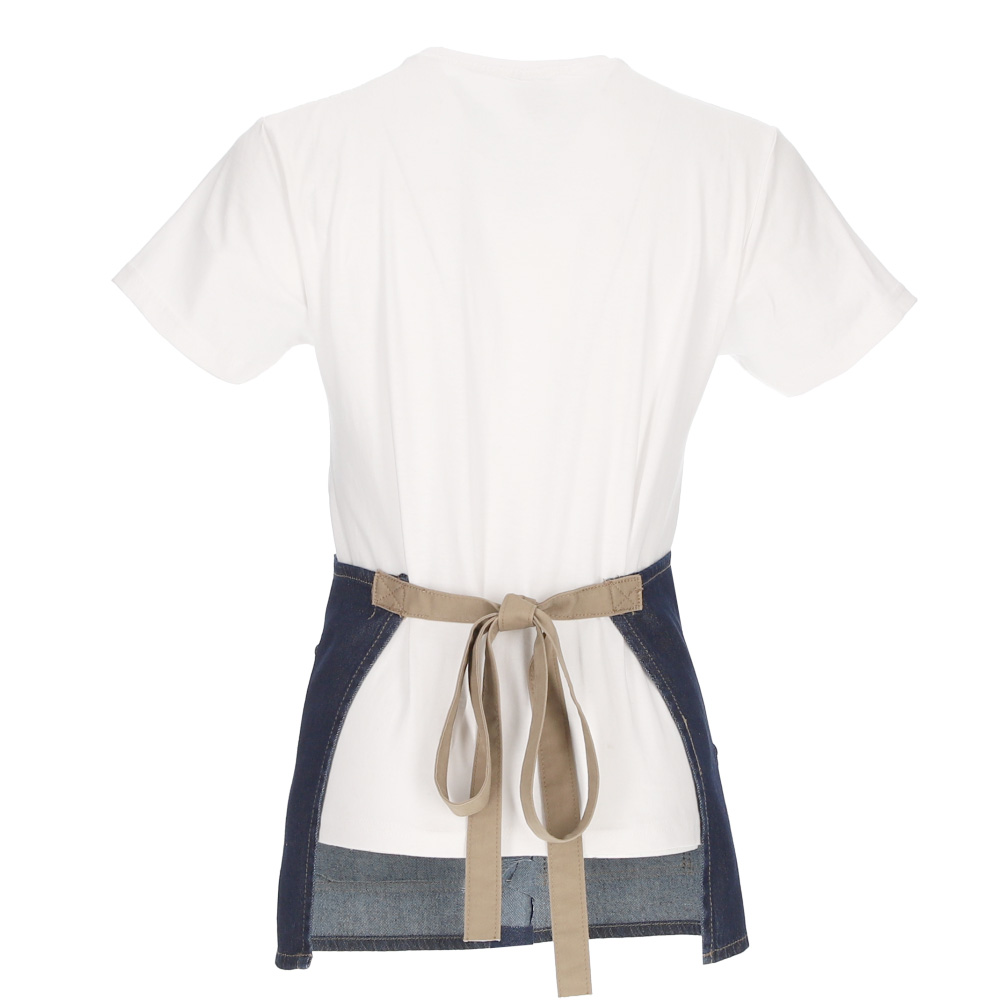 Grembiule senza pettorina in jeans multitasche. Realizzato in tessuto denim prelavato 100% cotone morbido e confortevole, lacci laterali spessi, color cammello, per adattarsi mediante nodo alla vita, ampia tasca a scomparti per avere tutto a portata di mano, incluso scomparto per penna, contorni ribattuti e borchie metalliche per rinforzarne la struttura.