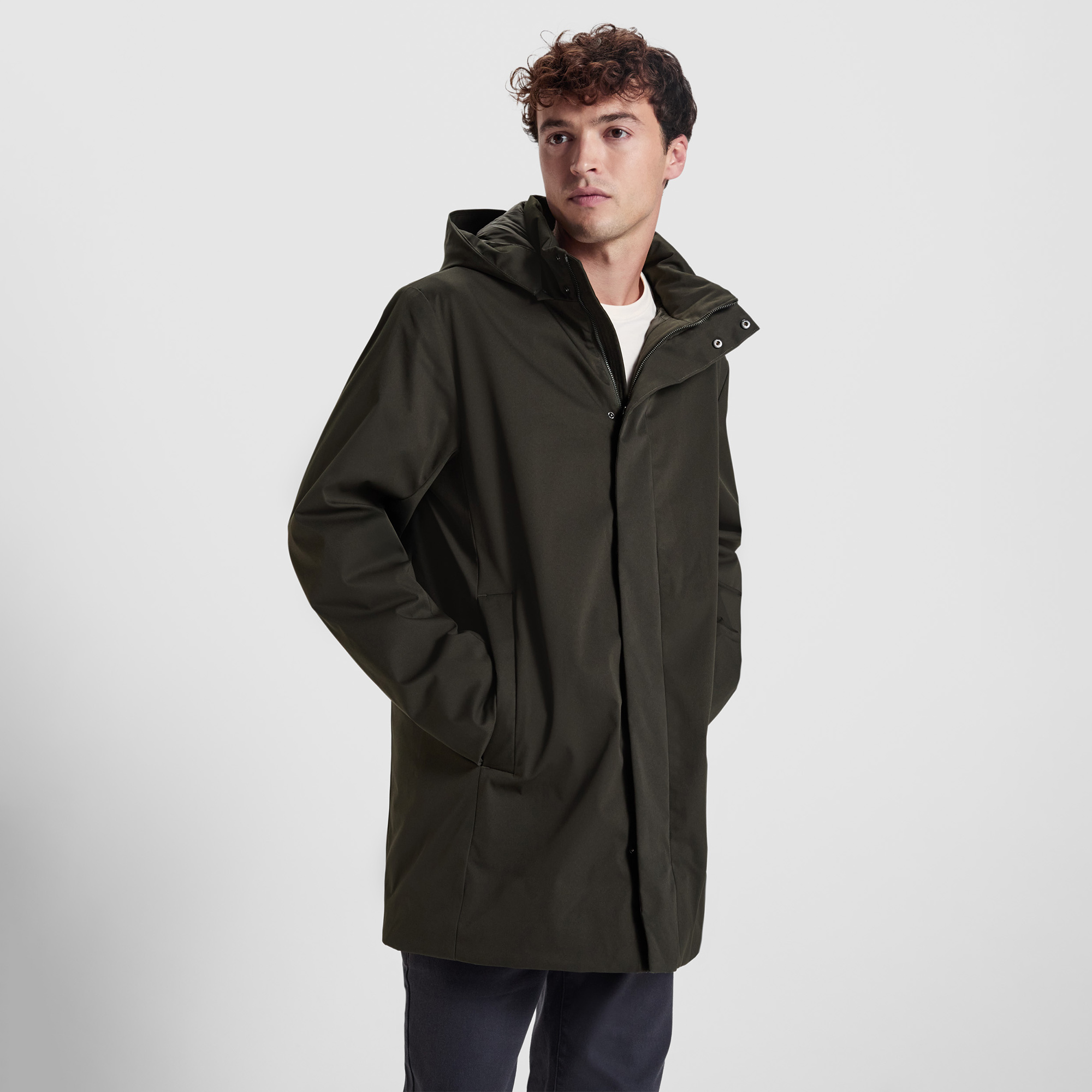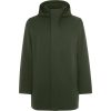 Parka trapuntato a 3/4 con collo alto e cappuccio rimovibile con zip. Zip frontale bidirezionale coperta da patta con chiusura con bottone a pressione. Due tasche laterali con patta e chiusura a bottone a pressione. Tasca interna con chiusura a zip invisibile. Punto di accesso sul retro per la rilavorazione.
