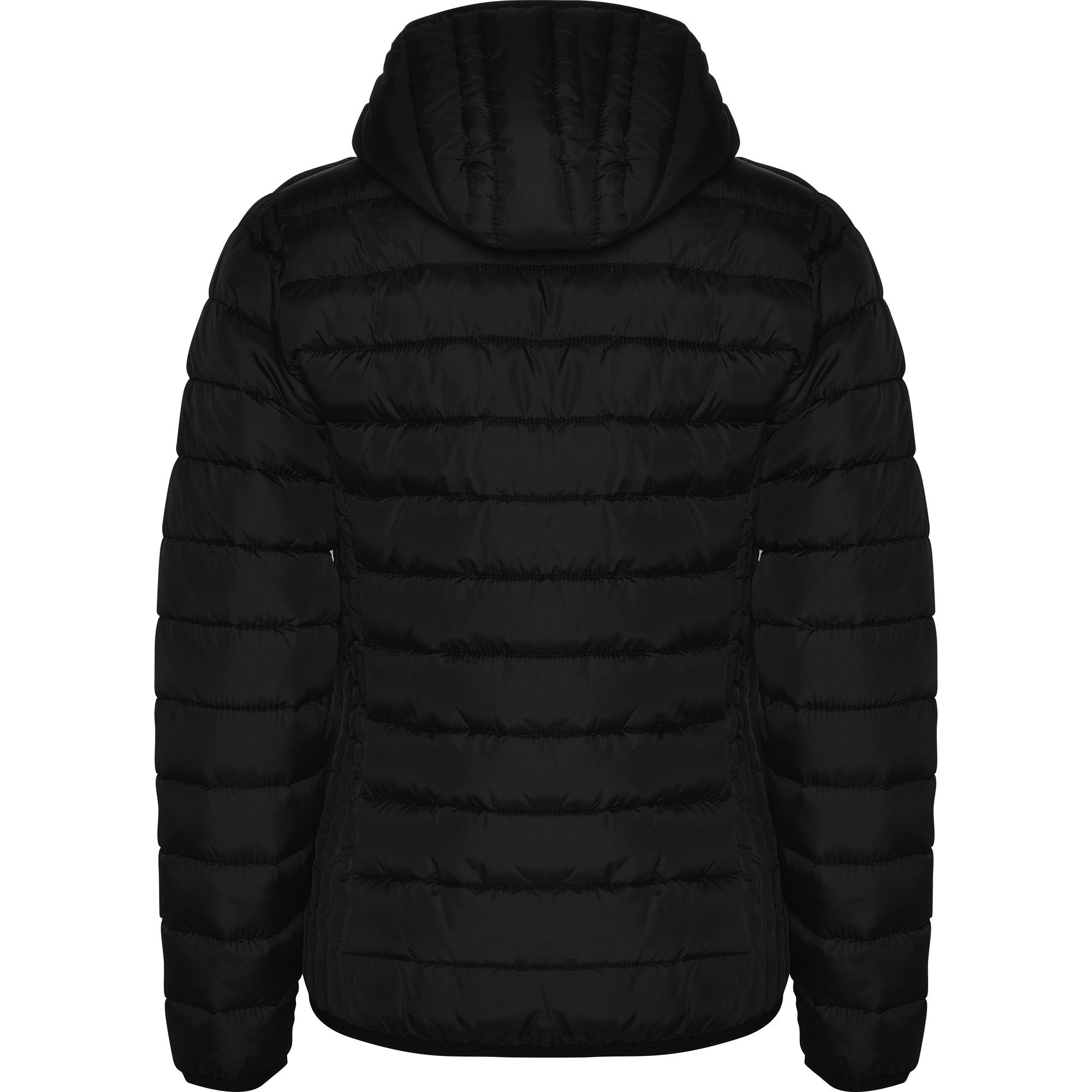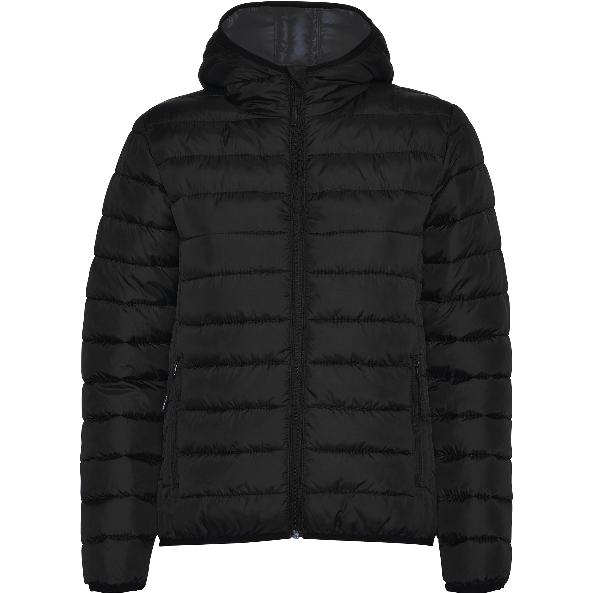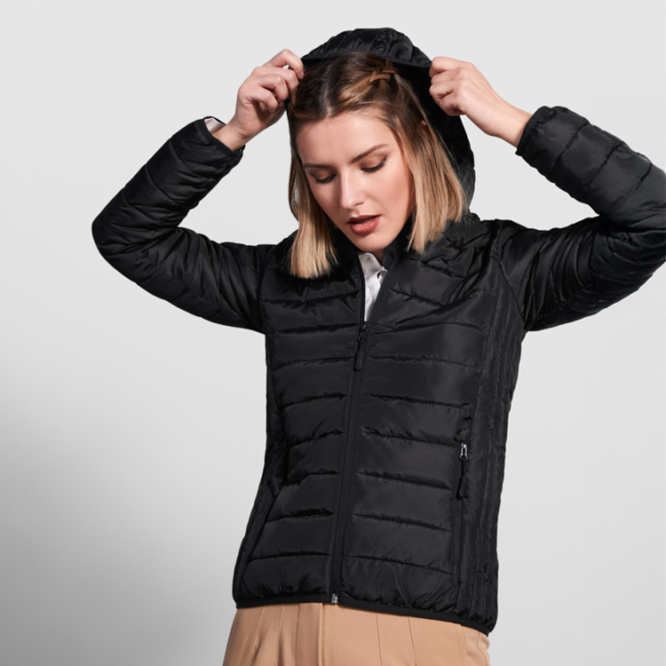 Giacca aderente trapuntata con cappuccio e imbottitura tatto piuma. Cerniere invertite in tinta con protezione per il mento e tiretto. Due tasche laterali con cerniera. Orlatura elastica in tinta su cappuccio, polsini e girovita. Rivestimento interno a contrasto. Indumento leggero e pieghevole.