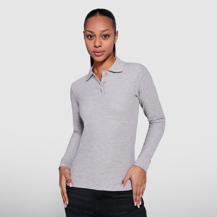 Polo a maniche lunghe in cotone. Punto piqué. Colletto e polsini intrecciati 1×1. Chiusura a 3 bottoni. Scollo nastrato in tessuto coordinato.