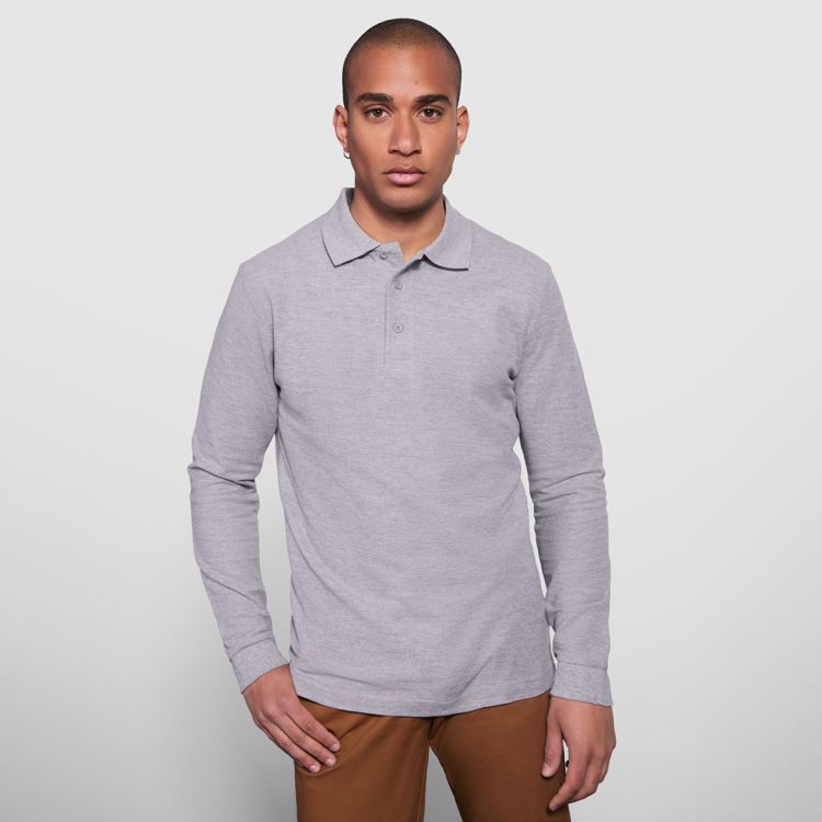 Polo a maniche lunghe in cotone. Punto piqué. Colletto e polsini intrecciati 1×1. Chiusura a 3 bottoni. Scollo nastrato in tessuto coordinato. Tasca, opzionale.