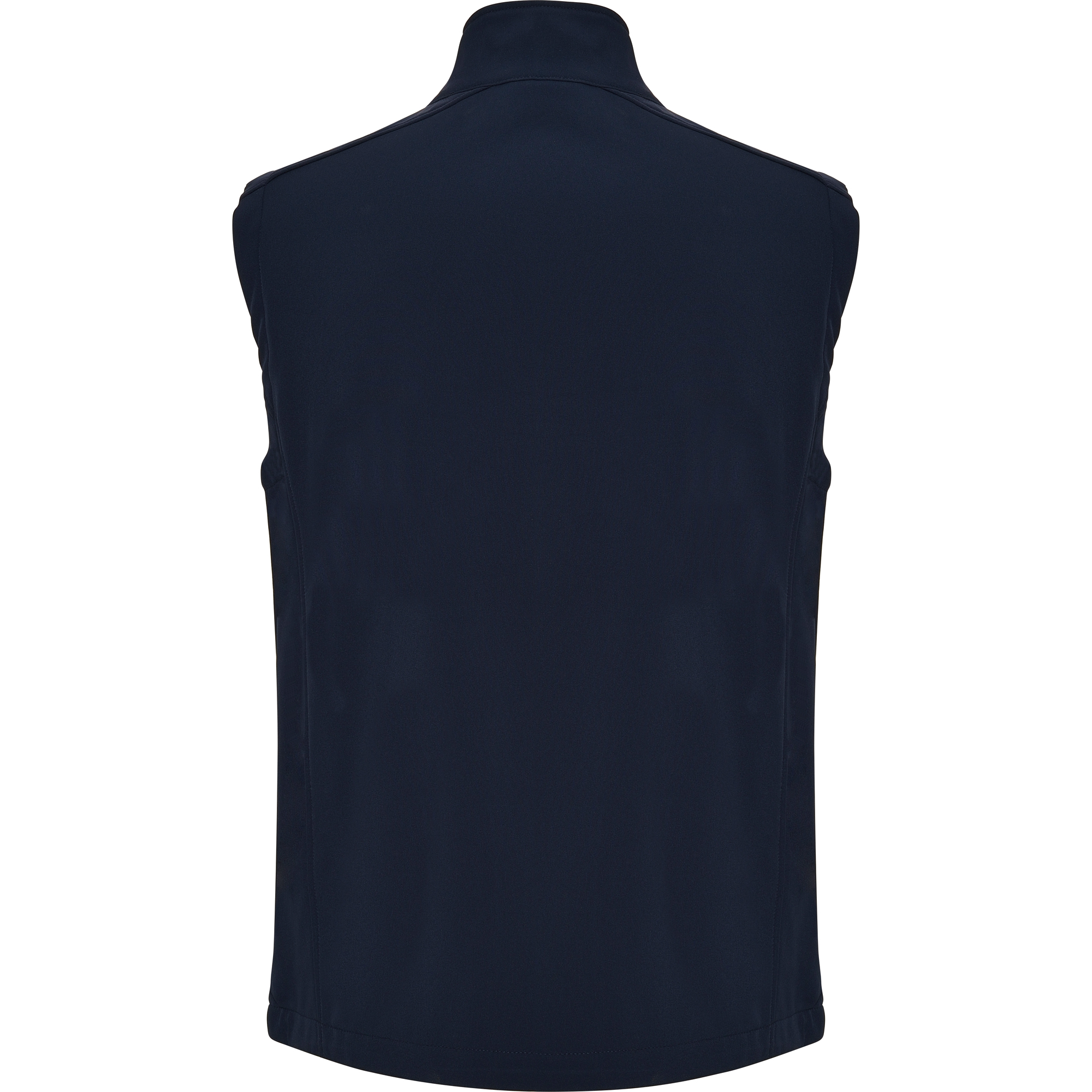 Gilet softshell a doppio strato. Cerniera invertita in tinta, con protettore mento e tiretto.