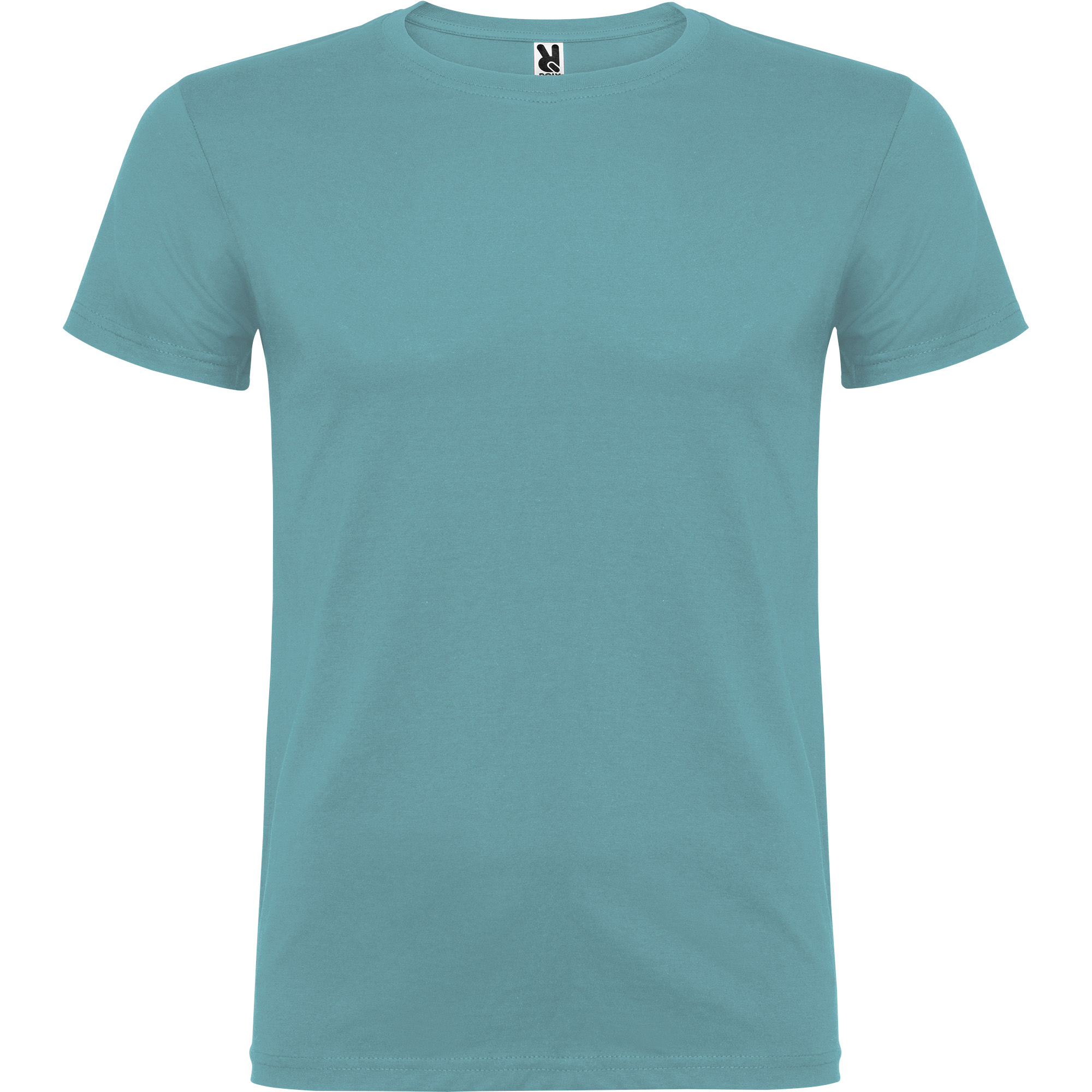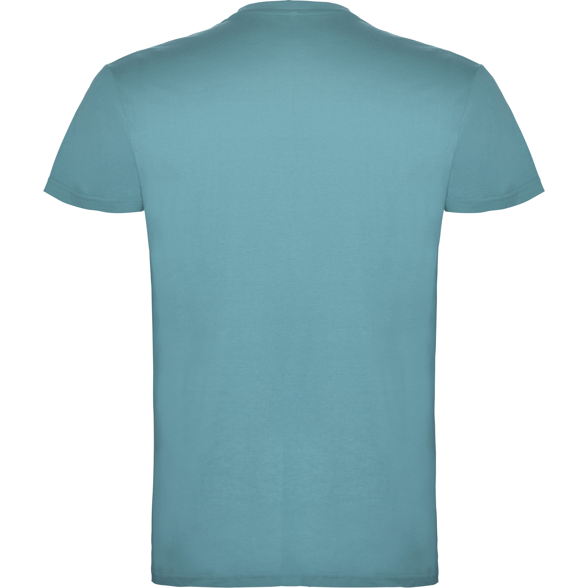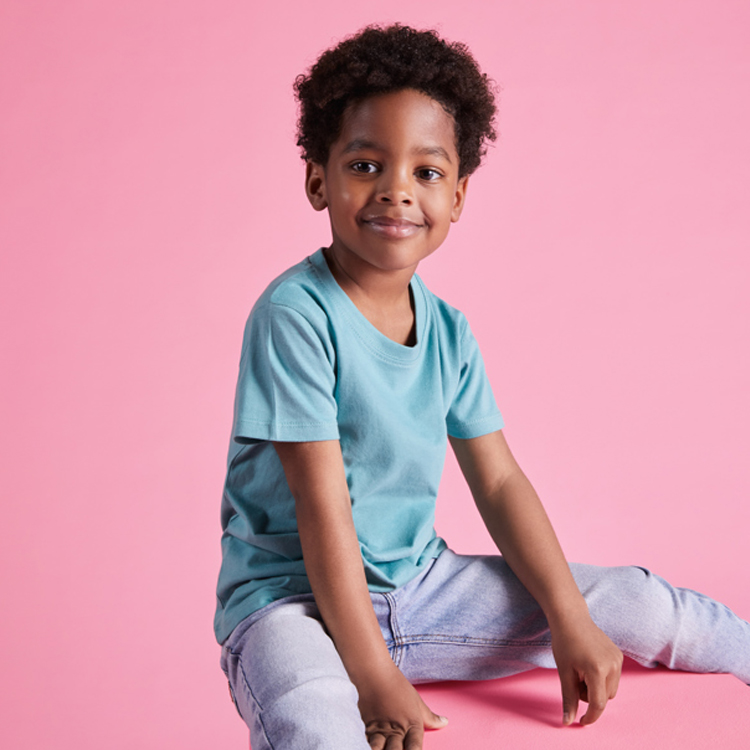 T-shirt tubolare a maniche corte con cuciture laterali. Girocollo a coste 1×1. Scollo nastrato in tessuto coordinato.