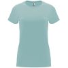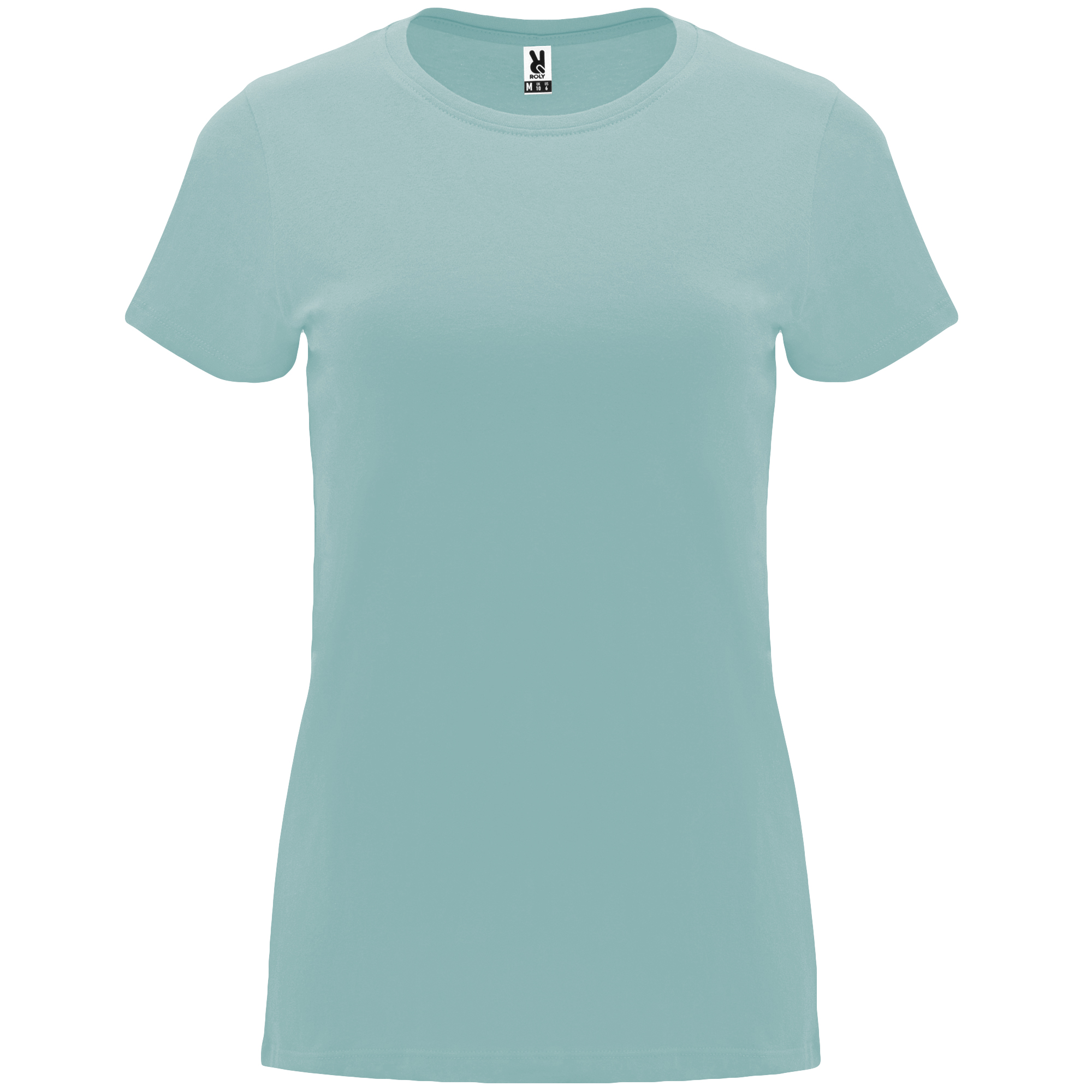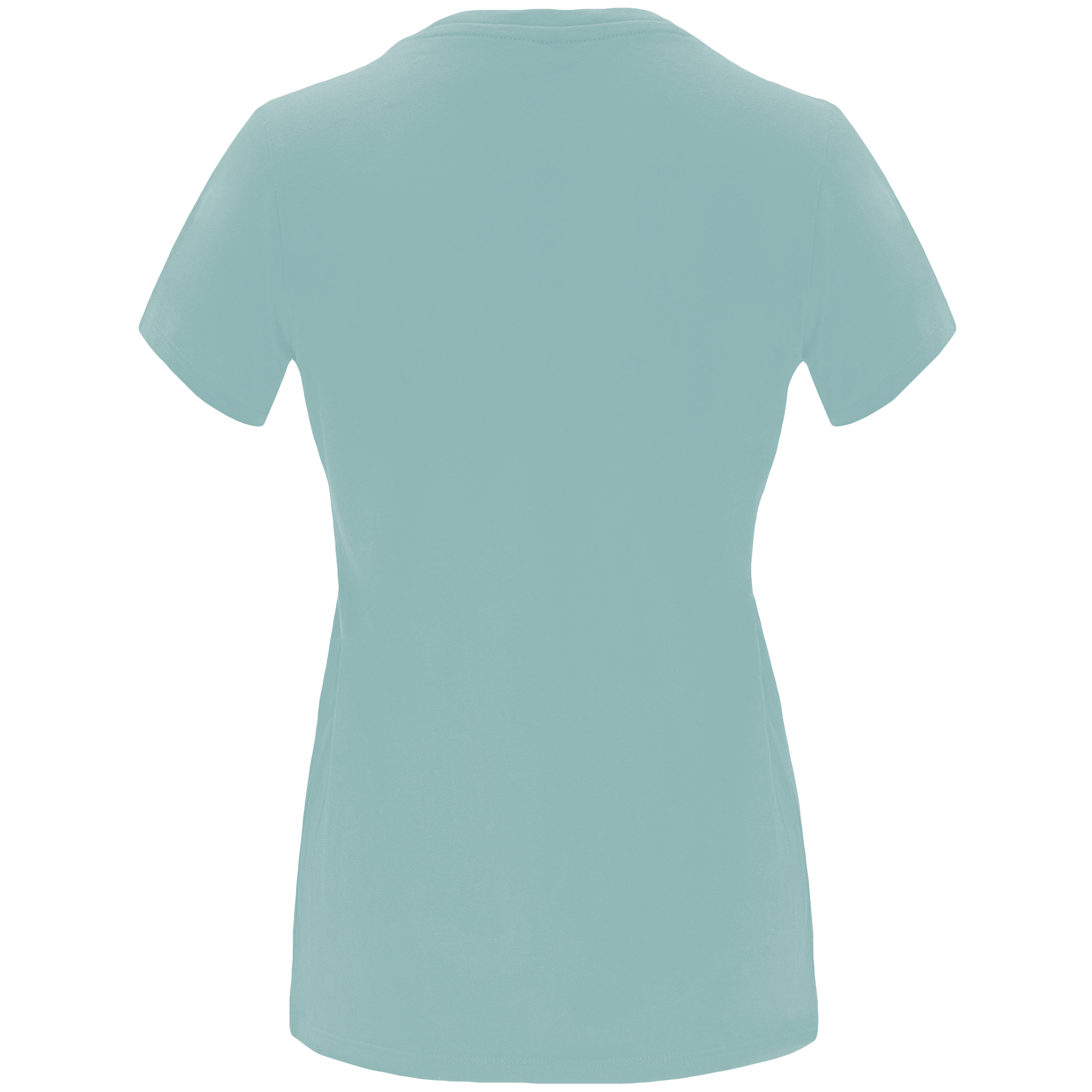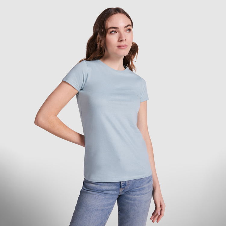 T-shirt aderente a maniche corte con vita affusolata. Girocollo a coste 1×1. Scollo nastrato in tessuto coordinato.