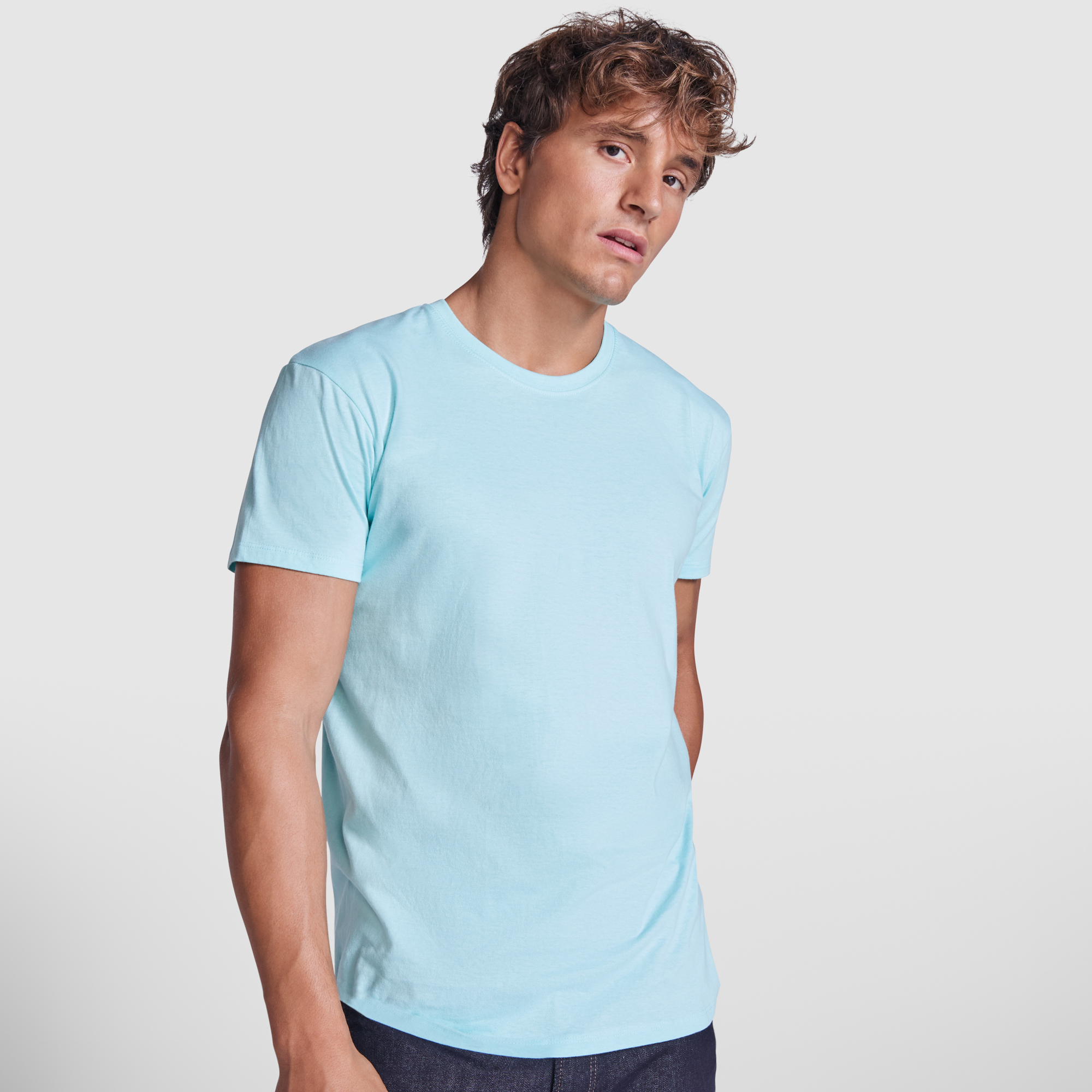 T-shirt tubolare a maniche corte. Girocollo a coste 1×1. Scollo nastrato in tessuto coordinato.