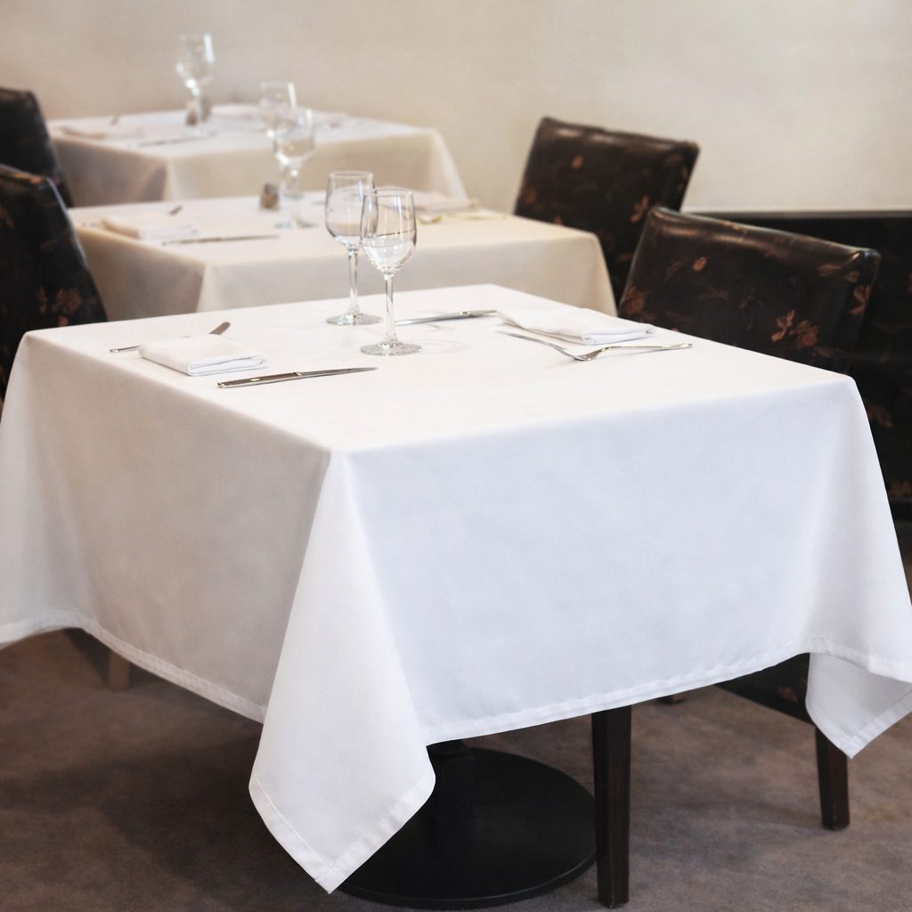 Tovaglia quadrata in tela. Realizzata in tessuto 100% poliestere satinato con finitura opaca, resistente, assorbente e duraturo, contorno con orlo decorativo.